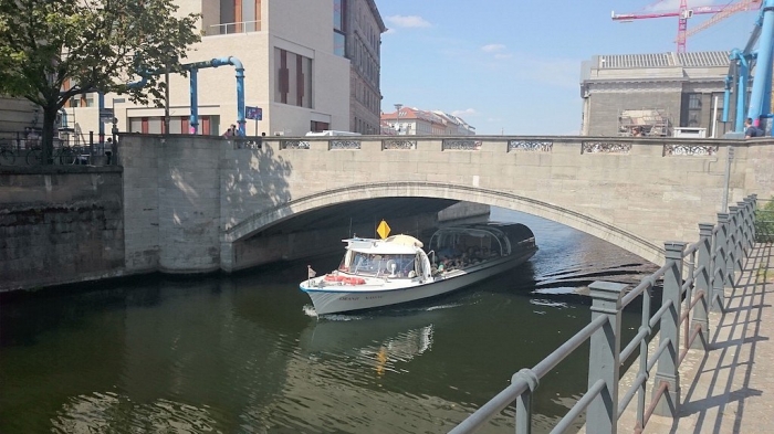 Textquelle: WikipediaDie heutige Eiserne Brücke ist das vierte Bauwerk an dieser Stelle. Ihr Name leitet sich von der zweiten Brücke ab, die eine der ersten Bogenkonstruktionen aus Gusseisen in Berlin war. Sie löste 1796 eine aus dem 17. Jahrhundert stammende Holzbrücke ab. Im Jahr 1825 musste die Eisenbrücke wegen ihrer Sprödanfälligkeit nach knapp dreißig Jahren durch eine dreifeldrige Brücke aus Sandstein ersetzt werden. Der alte Name wurde jedoch beibehalten.